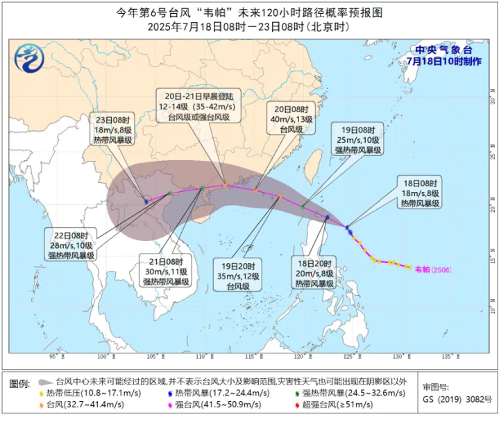 大风预报:18日至22日,南海北部、广东沿海、广西沿海、北部湾的风力有8至10级、阵风11至12级,台风中心经过的附近海域或地区的风力有11至14级、阵风15至16级。